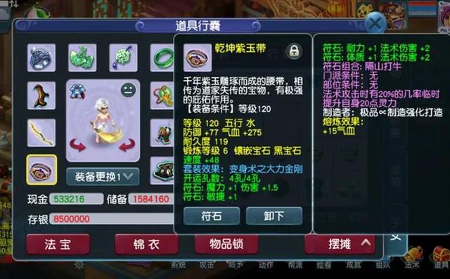 腰带是120级装备,点化了大力金刚套装效果,熔炼了气血15点,宝石依然选择了以速度为主的黑宝石。