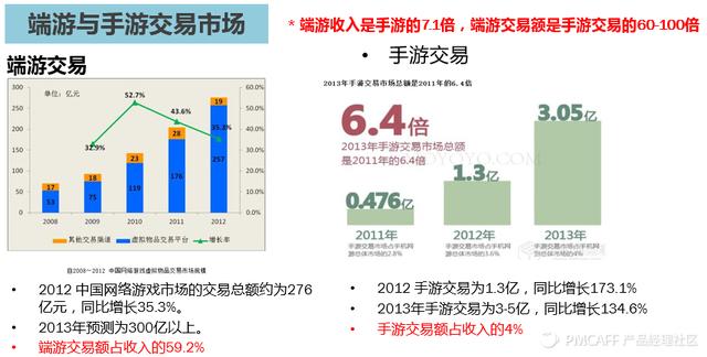 2011年端游市场368亿,增长速度15.17%,5173在2011年上市披露的交易金额是140亿,利润5亿(交易金额保守估计有90-110亿)。2012年开始,端游市场的增速开始下降,但是基于市场盘子仍然很大,所以5173的市场占有率不降反增。