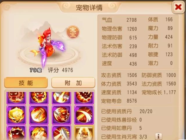 接着晒出来的是一只11技能的鲛将军,这只宠物的资质也非常不错,攻击资质1506、防御资质1000、体力资质3543,搭配上1.177的成长值,整体属性已经超越了精锐组大部分个性宠。