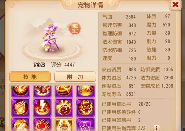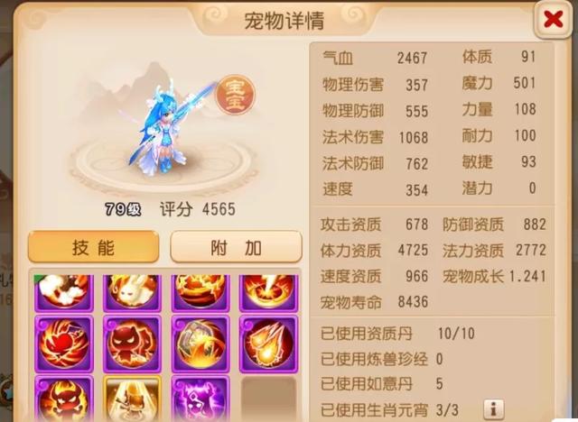 最后晒出的是一只认证10技能的蚌仙子,大家都知道蚌仙子由于速度资质比较低,所以经常被打造成龟速血宠,而这只蚌仙子2390的法力资质、4725的体力资质与1305的防御资质1305都非常不错,而速度资质仅为651,搭配上1.209的成长值,非常适合用来培养成为一只龟速法宠。并且值得一提的是,这只蚌仙子在技能配置方面除了增强输出与生存的技能搭配外,还将高级迟钝技能成功的保留了下来,在战斗中能够进一步降低自身速度值,用来守尸可谓是完美!