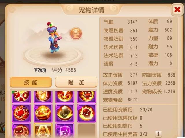 首先晒出的是一只认证9技能的千年僵尸,资质非常优秀,法力资质2268、体力资质5197和防御资质986,都属于精锐组主流水平,而且成长值也达到了1.219,整体属性十分出色。在技能方面除了认证的上古灵符单法技能外,还打上了泰山压顶群法技能,配合上大佬增加输出的技能,在战斗中既能点杀也能群秒!并且这只宠物还搭配了高级鬼魂技能,可以配合专属内丹的效果,在战斗中实现“永动机”的效果!