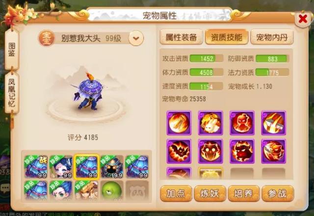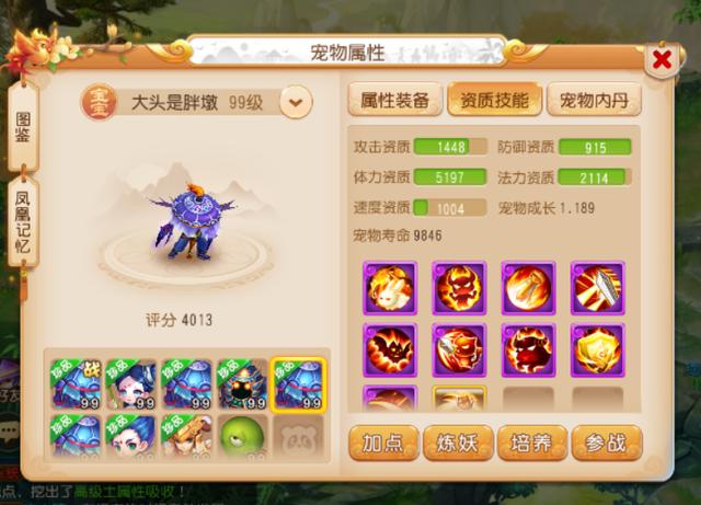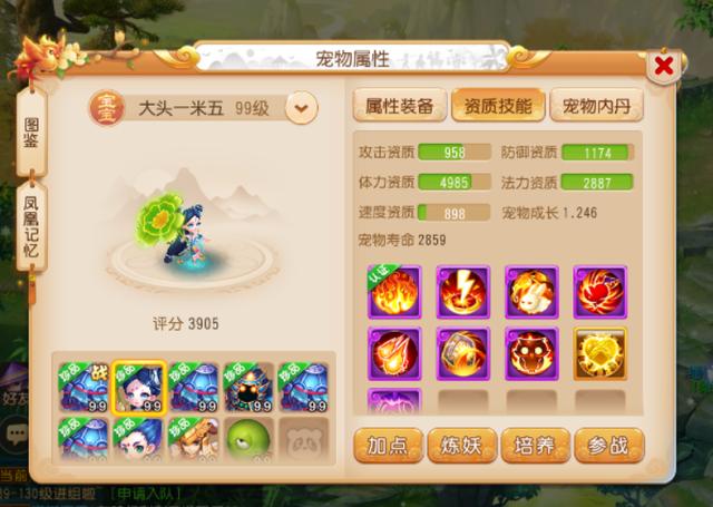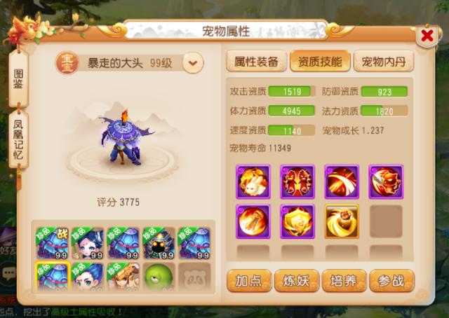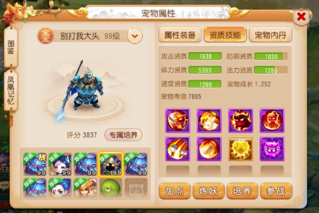 这两只法宠的属性都比较不错,同时技能也都打成了全红,拥有不俗的战斗表现。尤其是7技能珍露童子,在技能栏中还打上了高级感知技能,配合上专属套装的效果,在擂台PK中进行面伤压制非常好用!