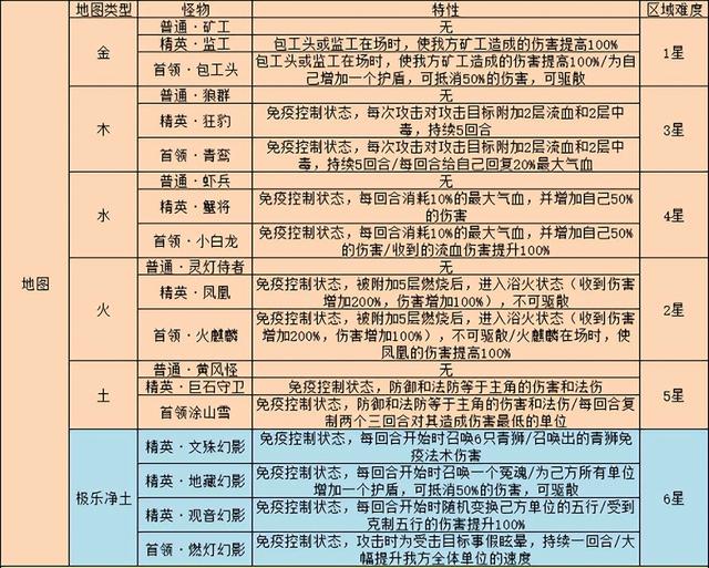进场后,有6个地图,依照五行九点钟方向逆时针为:金木水火土,以及极乐净土,地图区域难度及怪物类型,特性如下表所示: