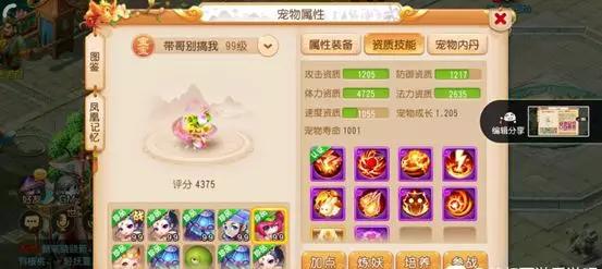 除了优秀的攻宠外,这名玩家还拥有不错的法宠,这只8技能的蟠桃童子拥有1217的防御资质、4725的体力资质、2635的法力资质与1.205的高成长值,非常出色。在技能配置方面,这只宠物除了法宠必备的技能外,还拥有高级会心、高级法术波动来进一步提升输出能力,在战斗中伤害不俗;同时这只宠物还拥有高级感知技能,不仅可以对敌方隐身单位造成威胁,并且还有10%的概率减免30%所受的伤害,可以提升不小的站桩能力。除此之外,这只蟠桃童子还拥有一个最特殊的地方,那便是在搭配专属内丹与专属装备效果后,每3回合结束时都能为主人回复自身法术伤害相关的气血,并且清除一个非封印的减益状态,无论是难度任务还是擂台竞技,都具有极强的实用性。