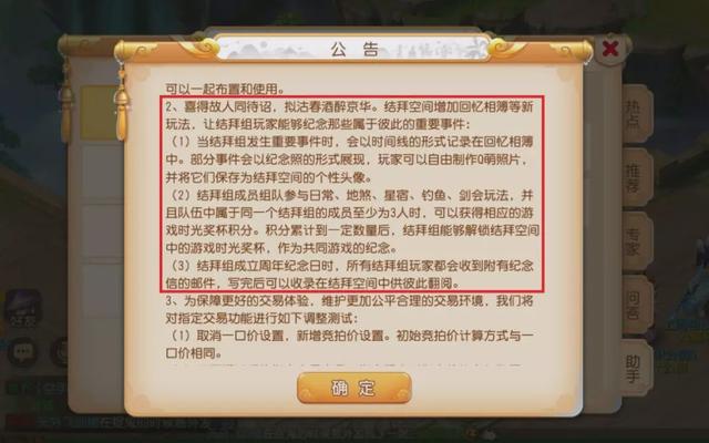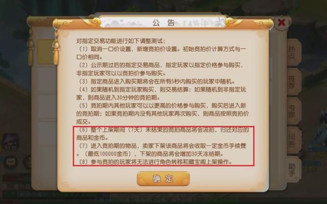 首先就是指定交易功能的全新调整了,与上周相比,本周指定交易功能除了原有的竞拍期规则以外,新增了下架竞拍期商品会增加30天冻结期的设定。同时卖家下架竞拍期商品将会收取最低10万金币的手续费,卖家在做出上架和下架操作时都需要慎重考虑,避免了恶意下架的可能。
