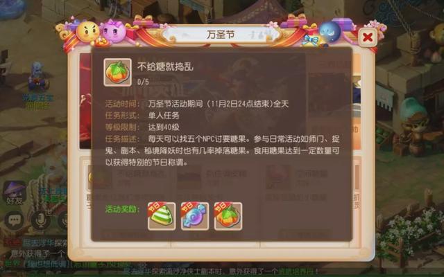 首先就是不给糖就捣乱了,大家每天可以找任意5个NPC讨要糖果,同时参与师门、捉鬼等日常活动时也有几率掉落糖果。食用糖果不但可以获得节日积分,达到一定数量还可以获得特别的节日称谓!