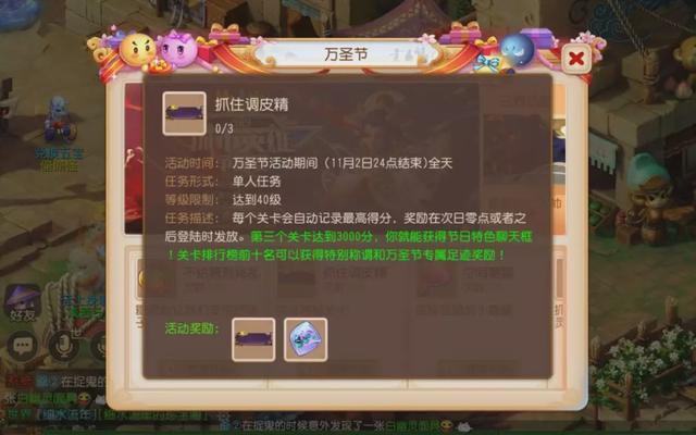 活动共有三个关卡,从简单到困难分别为:捣蛋小鬼关卡、调皮匠关卡、恶作剧大王关卡。第一次恶作剧大王关卡达到3000分后,就可以获得万圣节专属冒泡框一个!而每天24:00时处于某个关卡排行榜前十名的玩家,则可获得对应的关卡称谓奖励和万圣节限时足迹一个!
