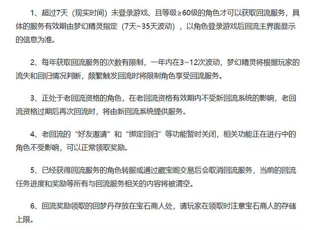 上面就是老玩家回来调整之后需要注意的事情,需要在限时时间内超过七天没有登录才能够获得,而且一年内可以领取的回流服务的次数是有限制的,一般在3到12次波动,将会根据具体情况进行判断,现在正处于老版本回流角色的玩家在有效期内将不会享受新回流系统的影响,而且老玩家回流的好友邀请跟绑定回归功能将会暂时关闭,也就是大家没办法出售角色的老玩家回流状态了。