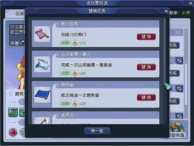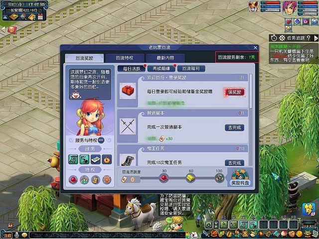 迭代之后的老玩家会获得回流任务,在回流角色首次登录时与梦幻精灵签订回流服务,届时会在游戏界面的左上角出现一个回流任务,而且在老玩家回流任务中还会有回流剩余时间的限制。