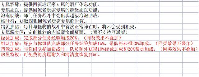 黑色字体的是回流专属服务,红色字体的是回流特权,在回流服务中,新版的老玩家回流玩家将会获得专属的酒店休息服务,专属的超级巫医功能,而且在师门任务中还会出现超级泡泡的助战,也就是回流玩家做师门的风险性将会降低,除此之外还会获得四张老玩家回流专属临时符,获得首次阵亡时的免费功能,红色的加成都是需要各位玩家完成一定的事情来解锁的,大部分就是经验类的加成,然后就是修理房屋时可以免费将房屋的耐久度恢复到50。