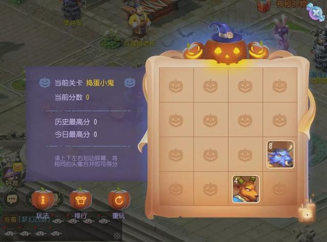 抓住调皮精,这是万圣节独特的趣味游戏玩法,挑战关卡时,向上下左右四个方向滑动,将相同的头像合并升级,来获得分数,当屏幕被占满时游戏结束。