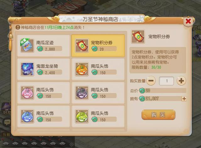 当然除了有趣好玩的活动以外,万圣节神秘商店也将限时开启,在商店里不但可以购买南瓜灯家具、南瓜头饰、宠物积分券、南瓜足迹等万圣节相关物品,还有万圣节专属全新坐骑鬼面龙等待大家哦!