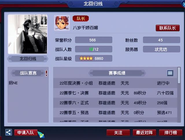 在【广东四区·状元坊】服务器中,有一支名为【北回归线】的天元组群雄战队,这支组建于2021年的战队虽然没有太过惊艳的成绩,但其凭借稳扎稳打的PK策略和灵活多变的阵容战术,在2022年七个赛季的群雄比赛中稳步向前,并在第七赛季的决赛中拿到了全服前64强的佳绩,非常难得。