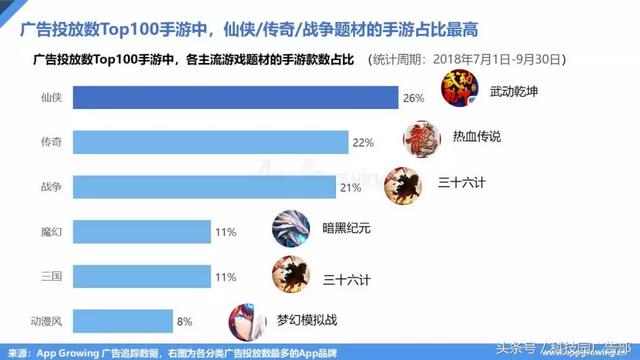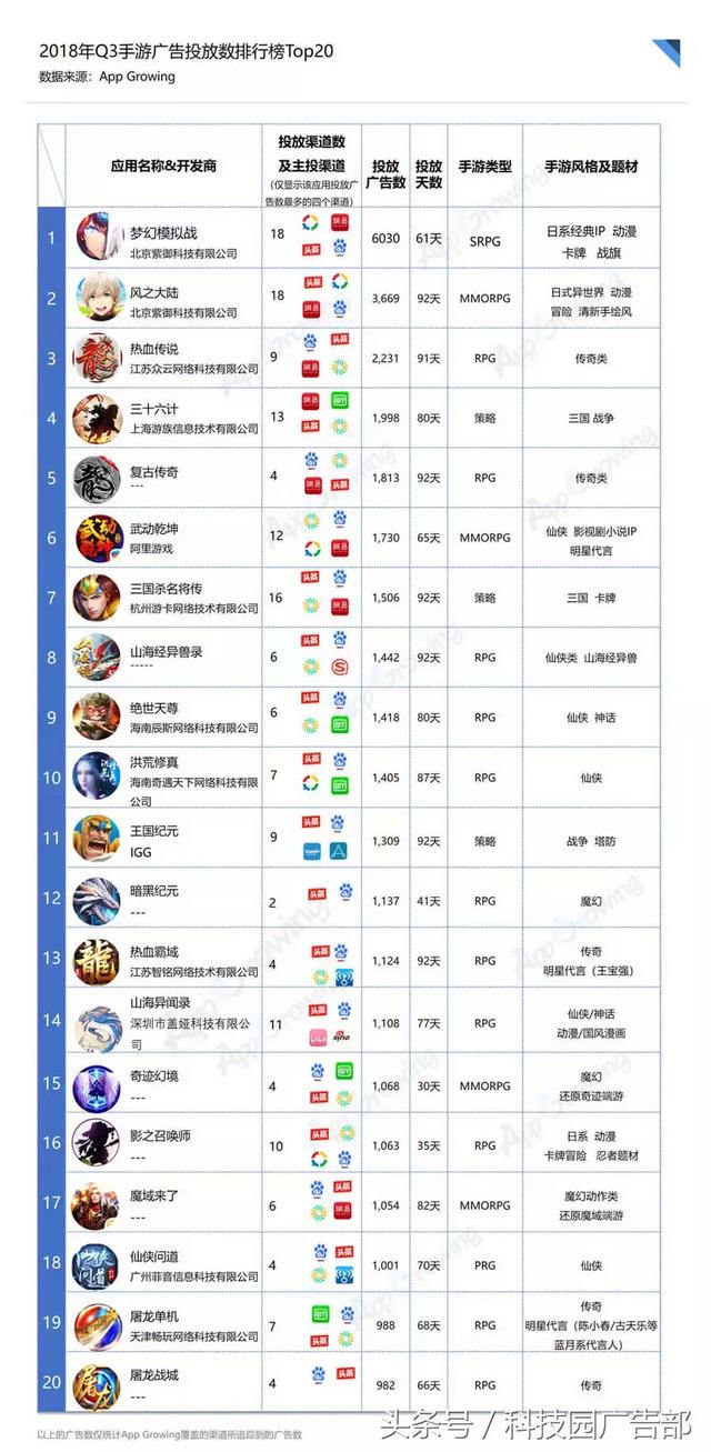 备注:本次报告以以App Growing于2018年Q3所追踪的28个移动广告投放渠道的手游移动广告数为依据,其广告投放数不等于其实际广告消耗。