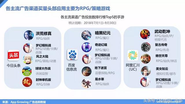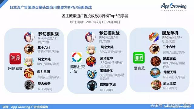 3)各主流渠道广告投放数排行榜Top5的手游盘点,买量头部应用主要为RPG/策略游戏