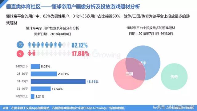 而垂直体育类社区懂球帝也名列全网手游投放数量Top10,战争、三国、传奇题材的手游也是该平台游戏投放的主要类型。根据艾瑞数据统计,懂球帝男性用户占比超过82.12%,用户群体主要集中在31-35岁年龄层,付费潜力较大,跟这几类题材的手游目标用户相关性较高。