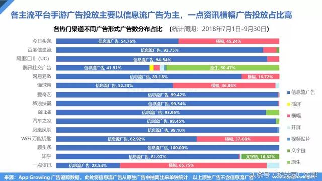 2) 各主流平台手游广告投放主要以信息流为主,一点资讯横幅广告投放占比高