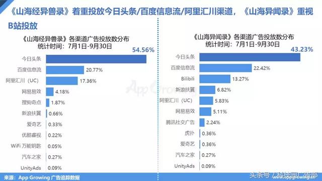 鉴于其不同的游戏风格设计,其在投放渠道策略方面也有所不同。《山海经异兽录》着重投放今日头条,百度信息流,阿里汇川渠道,这几个渠道总占比超过90%。而《山海异闻录》投放广告数最多的渠道依然为今日头条,百度信息流,但鉴于其国漫特色,其在bilibili渠道投放较多,相关广告数占比达13.27%。