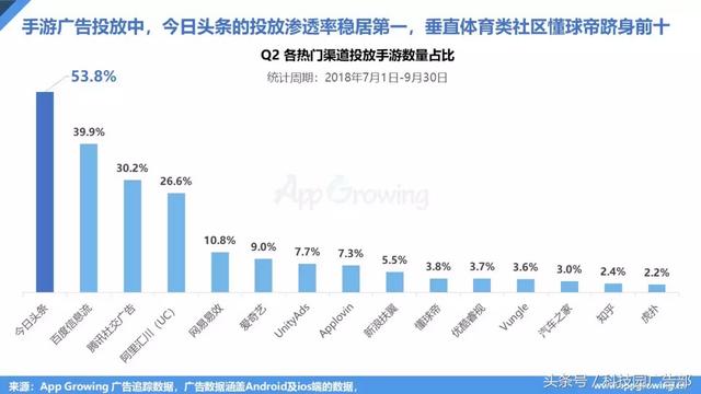 2018年Q3,今日头条平台的手游投放渗透率稳居第一,投放广告的手游中有53.8%的手游投放了今日头条渠道。