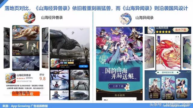 在广告投放素材方面,《山海经异兽录》基本是清一色各种大型异兽的形象为素材,打造宏伟与震慑感,而《山海异闻录》则更强调其国风漫画的特色,着重体现精美的角色立绘及动漫场景,国韵味较强,动漫插画版的素材设计,整体画面较为简洁(除角色名称介绍及应用名称后,基本不会穿插其他文字),也算是山海经题材中各类鲲系居兽投放素材的一股清流。而在落地页方面,这两款手游也沿袭了其投放素材的设计。