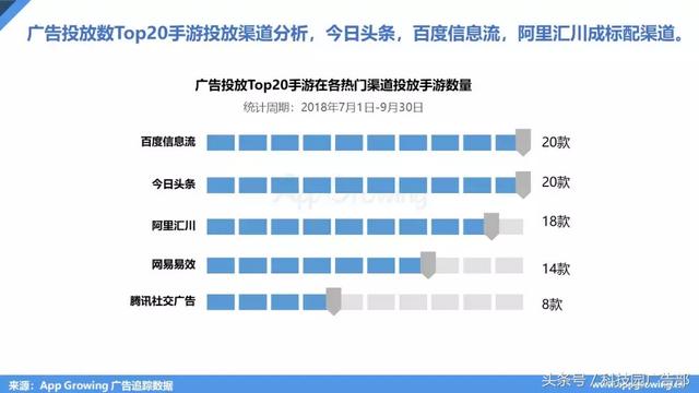 2)广告投放数Top20手游渠道分析,今日头条,百度信息流,阿里汇川成标配渠道。
