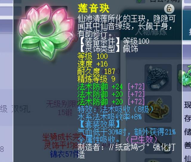 只不过这个是100级的,见到的不算是很多了。下排的3条都是法防,而且是把星辉石上到了9锻。而且特效也上的比较特别,不是传统的健步如飞之类的,是专门用来法术吸收的。这个灵饰目前的主人是一个地府,感觉还是很适合的。