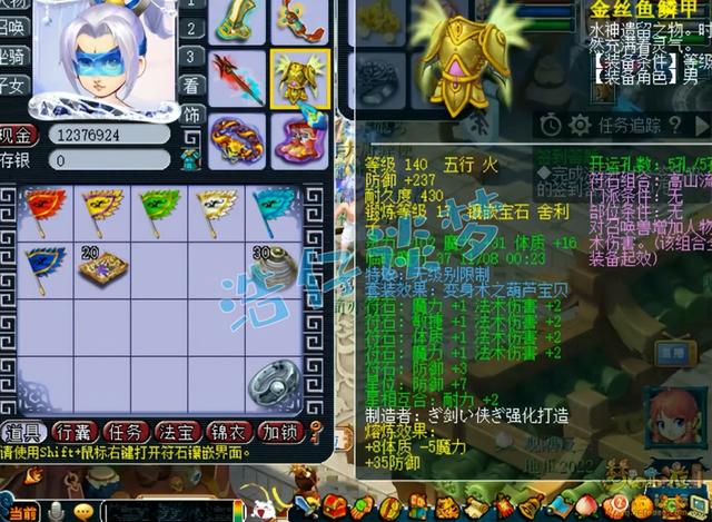 140级无级别葫芦宝贝套铠甲,熔炼后体魔双加50,防御272,打了17锻舍利子。