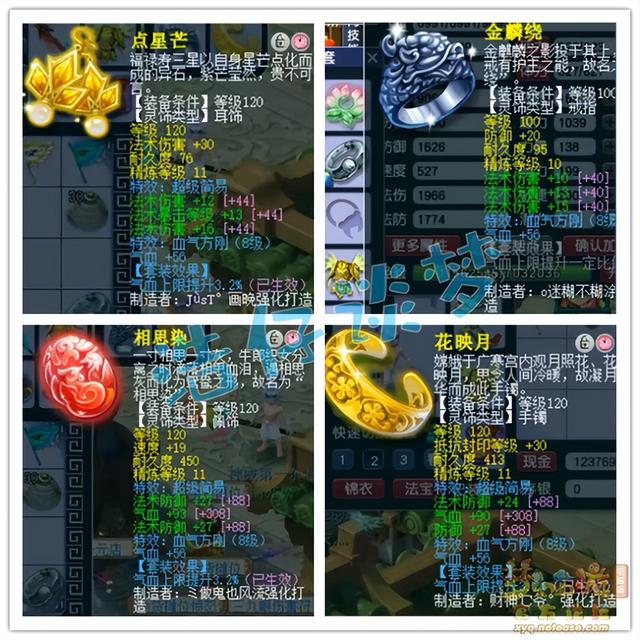 戒指100级的三法伤,耳饰120级超级简易,下排双法伤一法暴,佩饰和手镯都是120级超级简易,佩饰双法防一气血,手镯气血防御法防,特效选择了8级血气方刚。