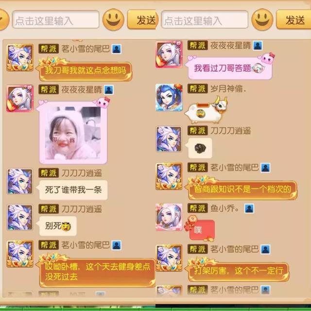 每天都一大堆人在一起聊天,早上是醒聊,中午是饭聊,下午是茶聊,晚上是混聊,当然有的时候也会尬聊的时候,基本没有出过矛盾。每天上线准时调至帮派频道,接收各门各类的信息,都是聊得不亦乐乎。