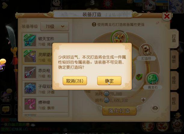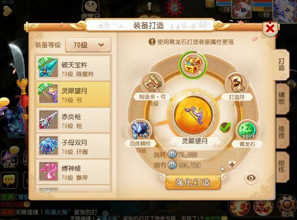 这位玩家要打造的是70级的弓,制造书、精铁、打造符和青龙石已经准备好了,直接开始强化打造!