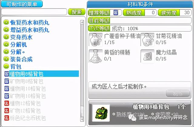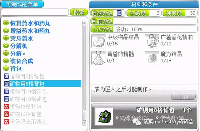 当到了11级匠人的时候,也可以通过制作植物、矿物8格背包进行升级: