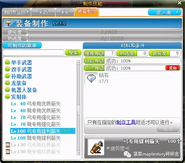 从7级开始可以制作100级的箭矢(钻石或者海蓝宝石):