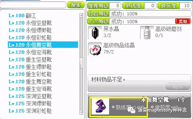 然后除了心脏,冲名匠最划算的就是做重生、永恒装备了,对比之下,做鞋子部位又是比较节约材料的一种选择,因此推荐做永恒鞋、重生鞋: