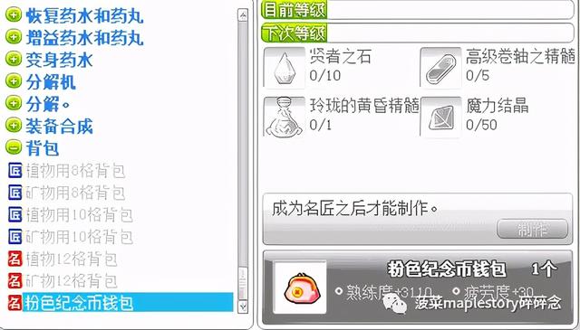 等到了名匠阶段,可以考虑制作粉色纪念币钱包进行等级维持: