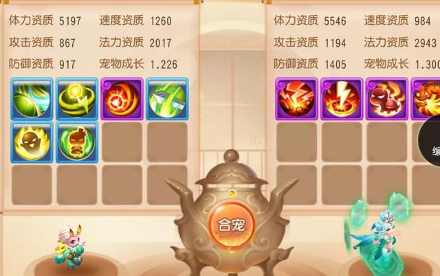 左边主宠选择的是一只6技能忘川童子,5197的体力资质、1260的速度资质均已经超出了上限,而1.226的成长也比较不错,唯一的短板是2017的法力资质较低,不过用来合宠还是足够的,可以通过副宠来拉高合宠资质范围上限。