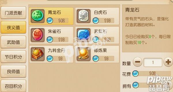 第二选择:石头,打装备换石头的玩家不少,但肯定不如前面的划算,毕竟换强化石需要的侠义值比较多,有这个还不如花仙玉直接买,但如果要换优先玄武、青龙,然后是朱雀,不建议换白虎石。而且换的话最好是星期三例行更新完或者凌晨两三点的时候去。