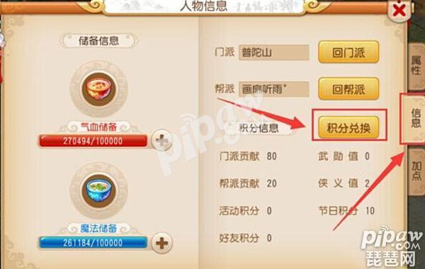 第二步、进入到属性面板以后,切换成信息面板,那里有个积分兑换,点击进去。