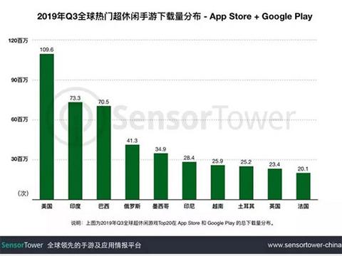 在App store统计的国家中,美国以1.1yì下载量排名世界第一,是休闲游戏的最大市场,在排名前100的手游中,有17kuǎn是中国游戏,收入占比14.5%。
