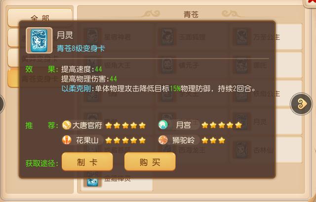 以月灵变身卡为例:月灵变身卡的加成效果是57速度和57伤害,以及以柔克刚——单体物理攻击降低目标15%的物理防御。