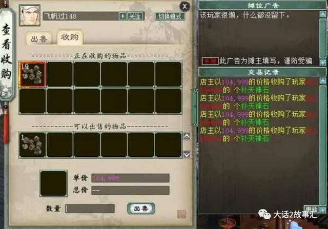 新区已经有一些骗子用148万收补天的招牌骗人了。实际的收购价只有10万多一点,还是有一部分玩家没注意看上当了,这里还是要顺带提醒一下广大玩家在集市交易的时候一定要睁大眼睛。