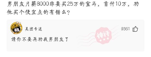 【沙雕问题6】男朋友月薪8000非要买25万的宝马,首付10万,劝他买个便宜点的有错吗?