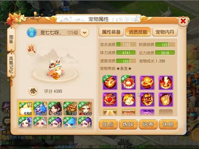 接下来是两只神威组的法宠吉里吉里,由于吉里吉里自身的特殊技能可以让自身受到物理攻击时有几率不受伤害,同时由于吉里吉里只能与变异宠物合宠,使得合宠得到的吉里吉里往往有非常高的资质和成长,因此是神威组服战大佬常用的法宠。第一只吉里吉里是8技能群法宠,宠物成长1.286非常接近满成长,可以说非常厉害了。同时法力资质2618远超宠物的最高资质,在高法连、高会心、高魔心和高法爆四个技能的加持下,这只宠物的输出能力可以说是非常恐怖的。