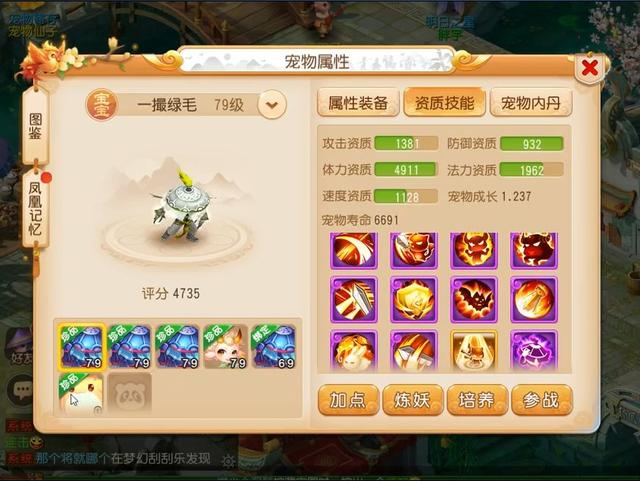 龟sù宠物迟钝,防御,神佑,招架的技能也有了,208的速度仅次于脱鞋后的龙宫。 而69级一般情况下速度拖鞋龙宫速度为188。