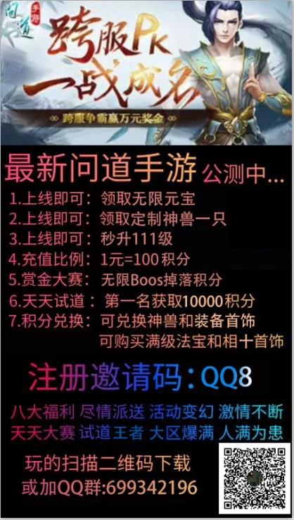 十年问道,十年等待,和你一起回忆那年的青春,那年的问道。十年再相逢,饮下这杯酒,共话《问道》新篇章。全新定制版問道手游:1,上线110级,无限元宝,送定制神兽,北极熊2,杀怪掉落积分,人人都可以积累积分购买成品物品3,成品装备,首饰,法宝可以直接在周建华处购买4,增加抽奖机制,积分抽奖掉落大量道行,定制神兽,法宝,装备等5,全自动挂机刷道6,无限刷boss,上古,妖王,等7,调整法可以技能7,力破技能58,新增boss玩法,自己体验9,所有好东西都可以积分换取,大家平等10,日常任务基本全部修复,打造持久耐玩万人服!欢迎体验,吓载加裙699342196关联问道手游,无限元宝,定制