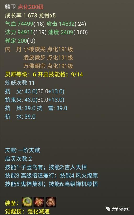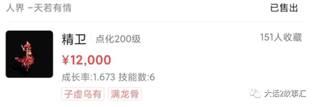 战术宝宝子虚乌有的精卫成交价格是12000元。点化200级的精卫速度2409,血量大概7.5万,仙法和鬼火抗性已经打好,六开技能方面有终极技能子虚乌有,吉人天相,烽火燎原,鬼神莫测,高级禅机顿悟等,觉醒技是强化减速,非常省事的成品终极宝宝。