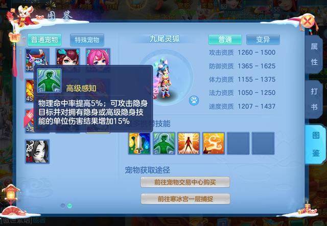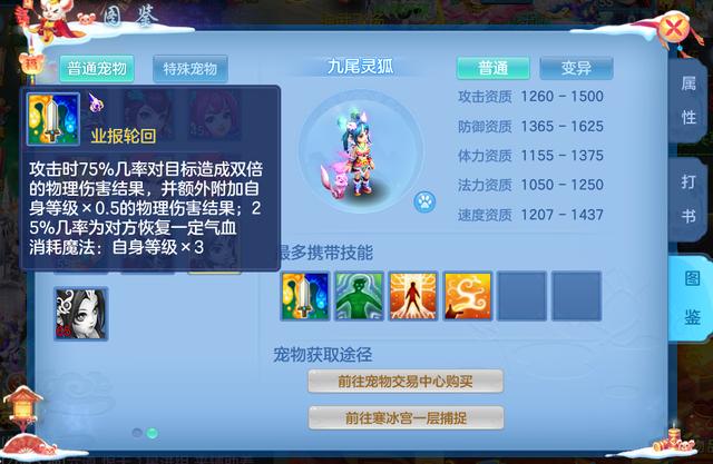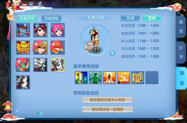 我们先来看一下变异九尾灵狐的各项资质,其1560的攻击资质上限超过神兽的资质。1690的防御资质就更厉害了,带上饰品后甚至能超过1700!在一般的宠物中属于极品存在。在在体速资质方面,狐狸都可以达到1400以上。总而言之,狐狸是一只十分优秀且值得培养的物理宝宝。