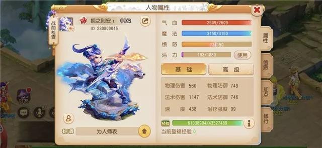 打开人物属性,这个号身上有6千万左右的经验。人物法伤1147,气血2609,物防749。1147的法伤是打了临时符的属性。从属性来看他除了气血偏低以外,其他属性还可以。
