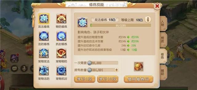 再来看下这号的修炼技能,人物3修已经点到了12,剩下的就是优先提升下宠物修炼。人物抗封和宠物抗封可以考虑最后提升,毕竟做任务的时候还是更看重人宠的前3个修炼。这里建议大家用九转金丹和修炼果来提升修炼,如果想快速追求修炼全满,可以充仙玉一步到位。