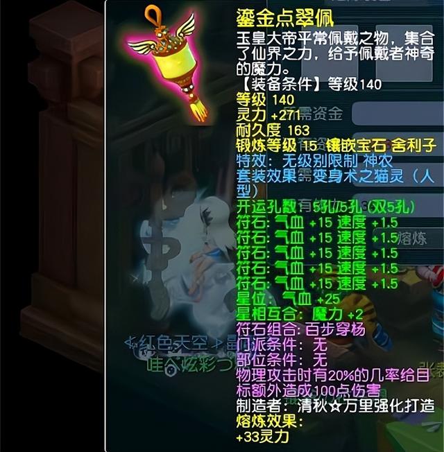 上面是一条140级拥有着无级别限制和神农两个蓝字效果的链子,这条链子镶嵌了15级的舍利子,熔炼增加了33点灵力呢,这条链子的初始灵力属性是181,可以熔炼的灵力的上限是36,现在已经熔炼了33了,感觉这位玩家应该不会再继续熔炼了吧。