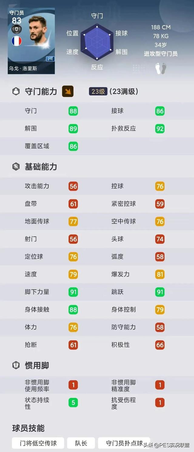 球员简析:洛里在实时状态E的掣肘之下,满级属性实际上还达不到C状态1级水平,此时的他大概率获得的都是↘和↓状态,守门员五维属性中将有4项数据低于90,因此本周已经不具备作为首发门将登场的实力。